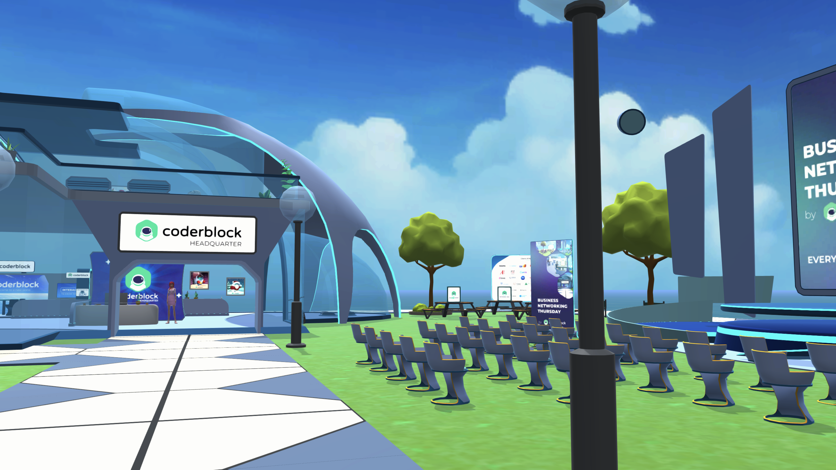 As mentioned, it's **accessible to anyone** who wants to learn how to create scenes and virtual experiences in just a few steps. It doesn't require any downloads and is available to all Landowners (owners of land in Coderblock) and Coderblock Studio's subscribers.