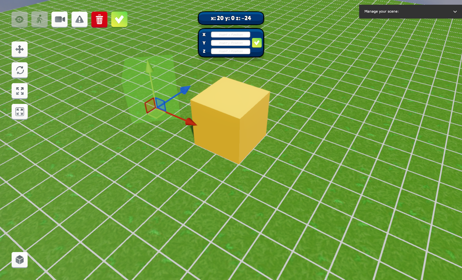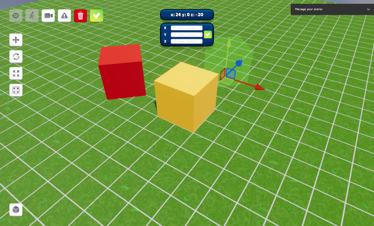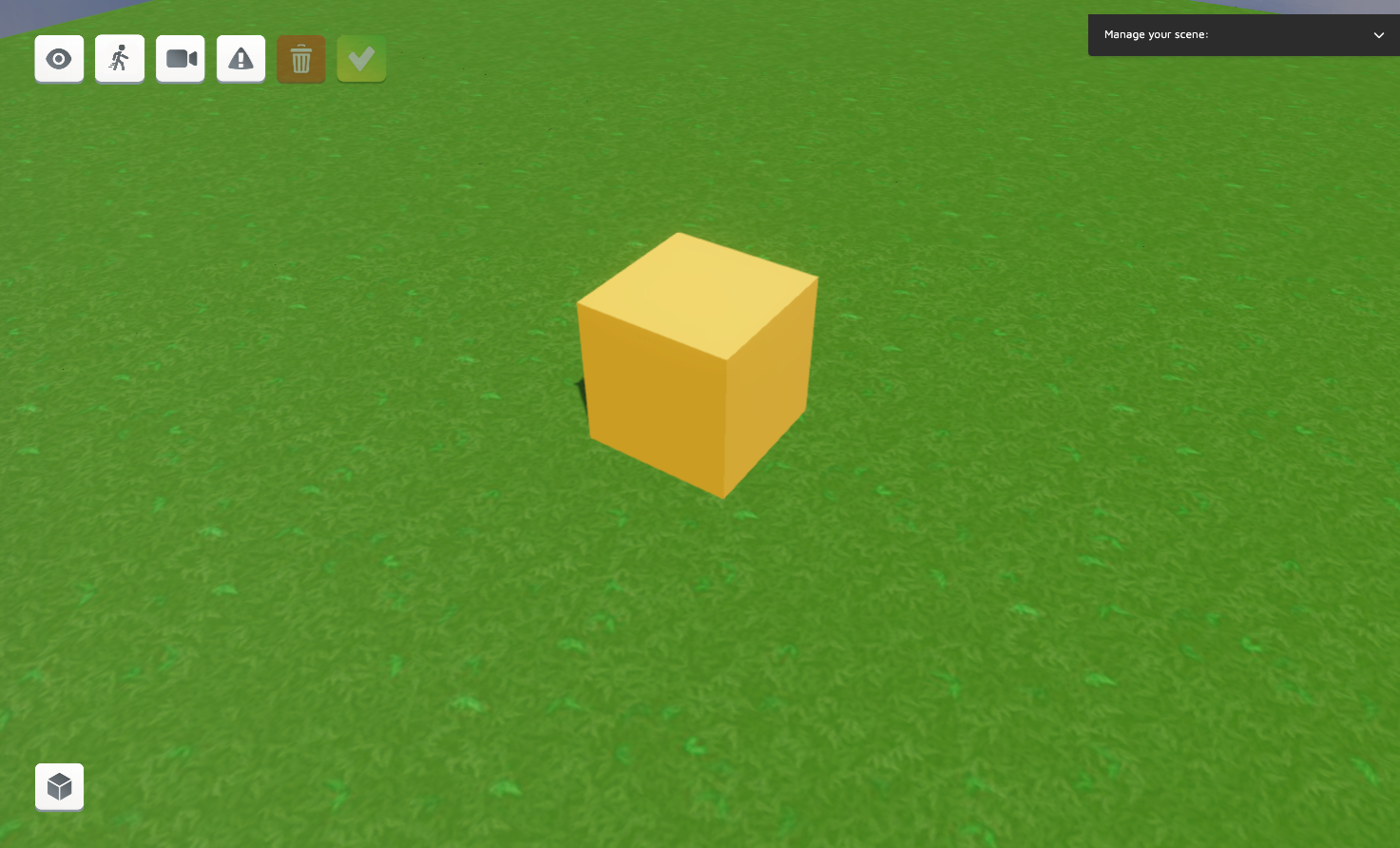 To give a demonstration of the copy/paste tool, we will use a variation of the playground by eliminating some of the objects in the environment, leaving only the yellow cube as a spatial reference in the center of the scene. We select them one by one and delete them with the Erase button