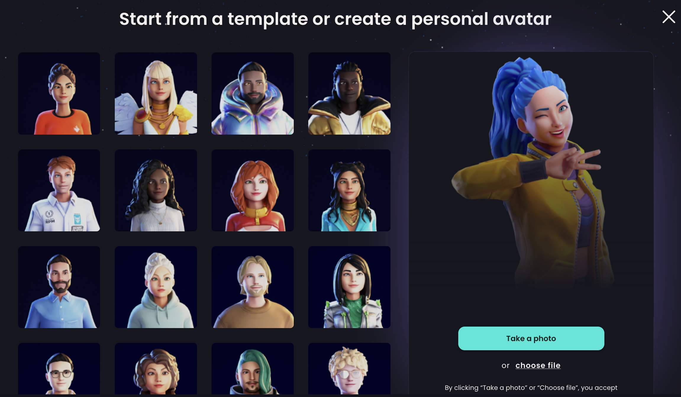 If you want to use **your photo** to create your avatar, simply click on 'Take a photo' or 'Choose file' and upload your photo. Your virtual alter ego will be created in moments, and you'll be amazed at how much it looks like you!\